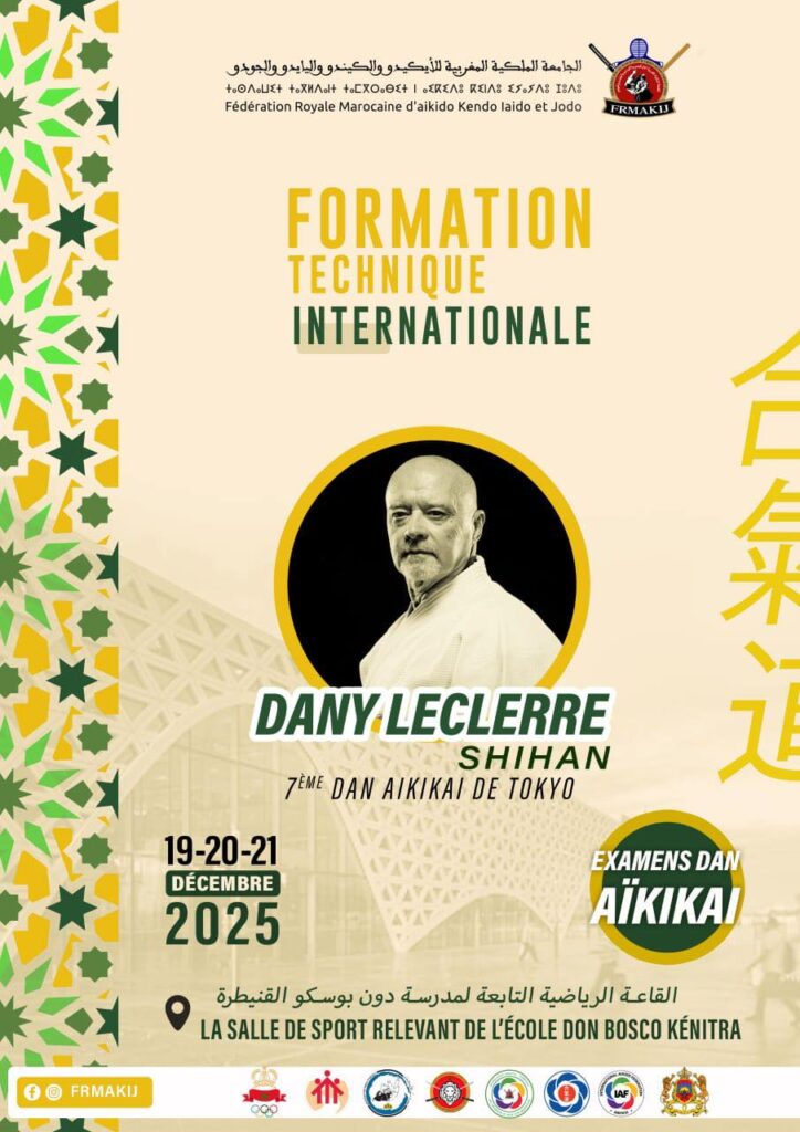 تنظم الجامعة الملكية المغربية للأيكيدو، الكيندو، اليايدو والجودو تدريبا تقنيا دوليا أيام 19 و20 و21 دجنبر 2025 بمدينة القنيطرة، يؤطره داني لوكلير شيهان ، 7ᵉ دان أيكيكاي طوكيو. ويأتي هذا الحدث ليمنح الممارسين فرصة للاستفادة من تجربة دولية متميزة تجمع بين العمق التقني والدقة في التطبيق.